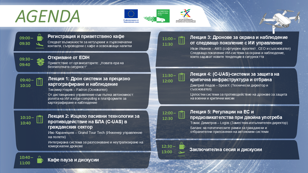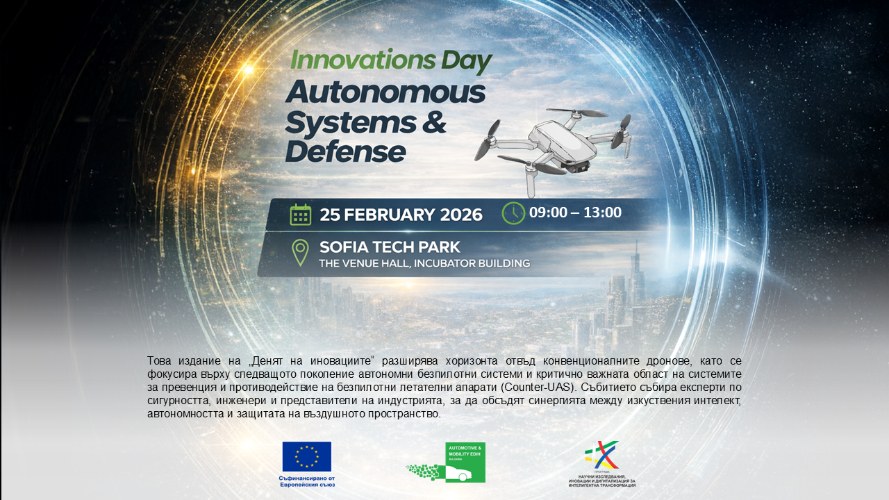 - На 25 февруари 2026 г. в Sofia Tech Park – The Venue Hall, Incubator ще се проведе събитието Innovations Day: Autonomous Systems & Defense, посветено на развитието на автономни безпилотни системи, изкуствен интелект и технологии за защита на въздушното пространство.