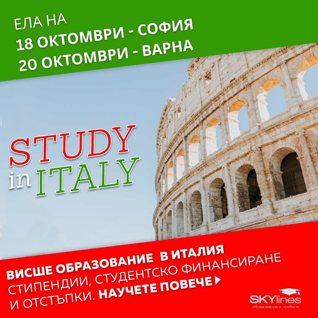 За поредна година консултантска агенция за образование в чужбина „Скай Лайнс“ организира единствения специализиран форум за висше образование в Италия - Study in Italy 2025. В изложението ще се включат някои от най-престижните учебни заведения от Апенините. Събитието ще се проведе на 18 октомври (събота) 2025 г. от 9:30 до 18:00 часа в СТЦ Интерпред, София, а на 20 октомври (понеделник) гостува във Варна в хотел „Галерия Графит“ – от 16:00 до 20:00 часа.